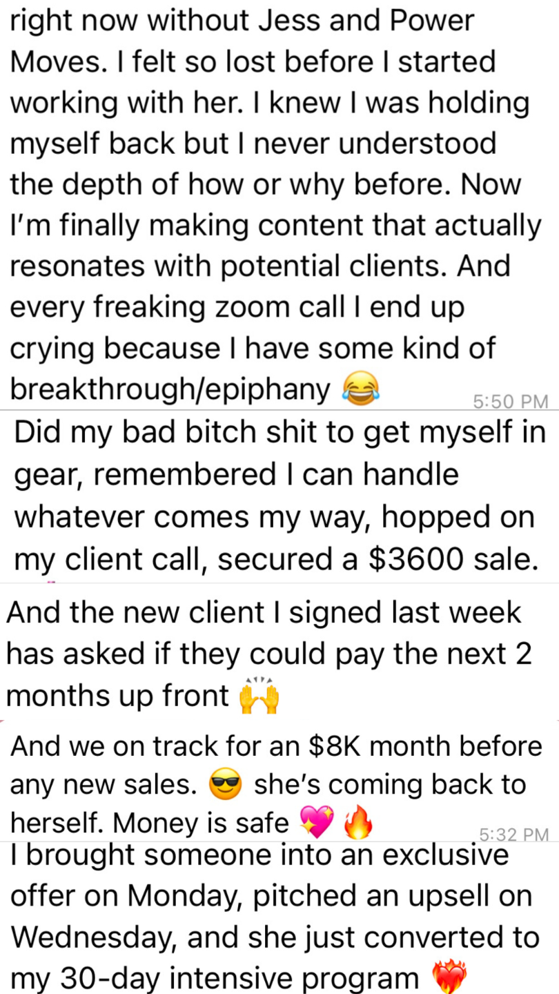 Power Moves is where we build the structure, sharpen the message & lock in the moves that scale without spiralling, starting over, or shrinking yourself.